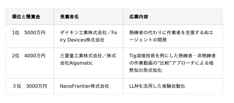 今回、社会課題領域114件(製造業:58件、CS:56件)、官公庁領域37件、安全性領域41件の計192件の応募から計42件の懸賞金受賞者を決定しました。なお、社会課題領域および安全性領域において受賞者を決定しましたが、官公庁領域は、本事業が定める受賞基準により、1位から3位までの受賞者は該当なしとなりました。