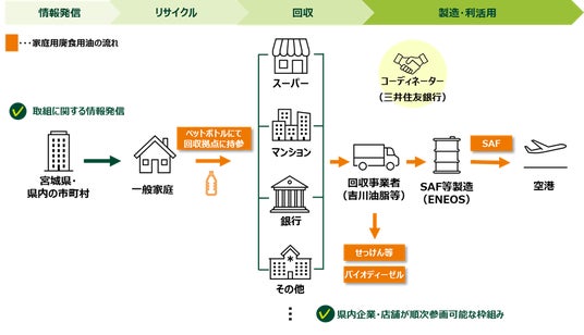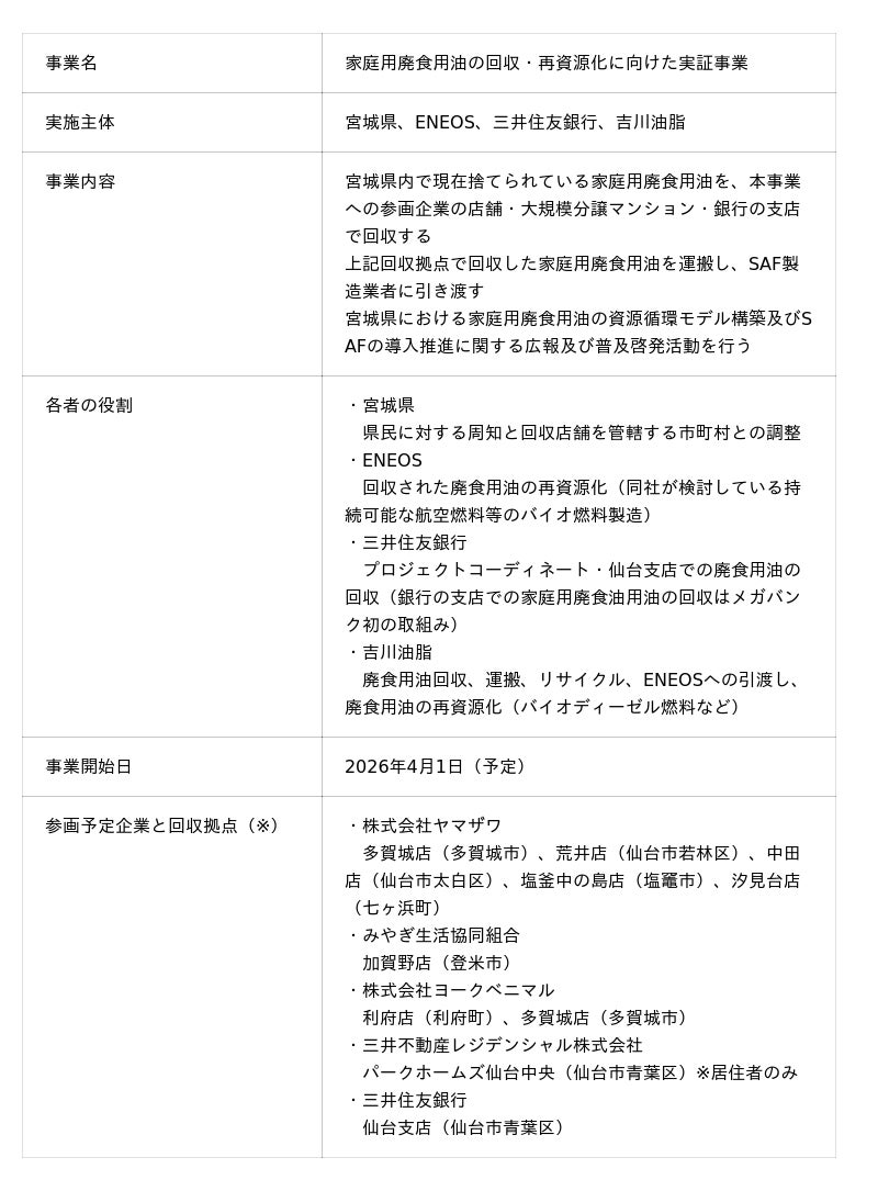 宮城県、ENEOS株式会社(以下、ENEOS)、株式会社三井住友銀行(以下、三井住友銀行)及び株式会社吉川油脂(以下、吉川油脂)の4社は、2026年4月1日から宮城県内のスーパーマーケットの店舗や大規模分譲マンション(居住区)、三井住友銀行の仙台支店等を拠点として、家庭用廃食用油の回収・再資源化に向けた実証事業(以下、本事業)を共同で実施しますので、お知らせいたします。