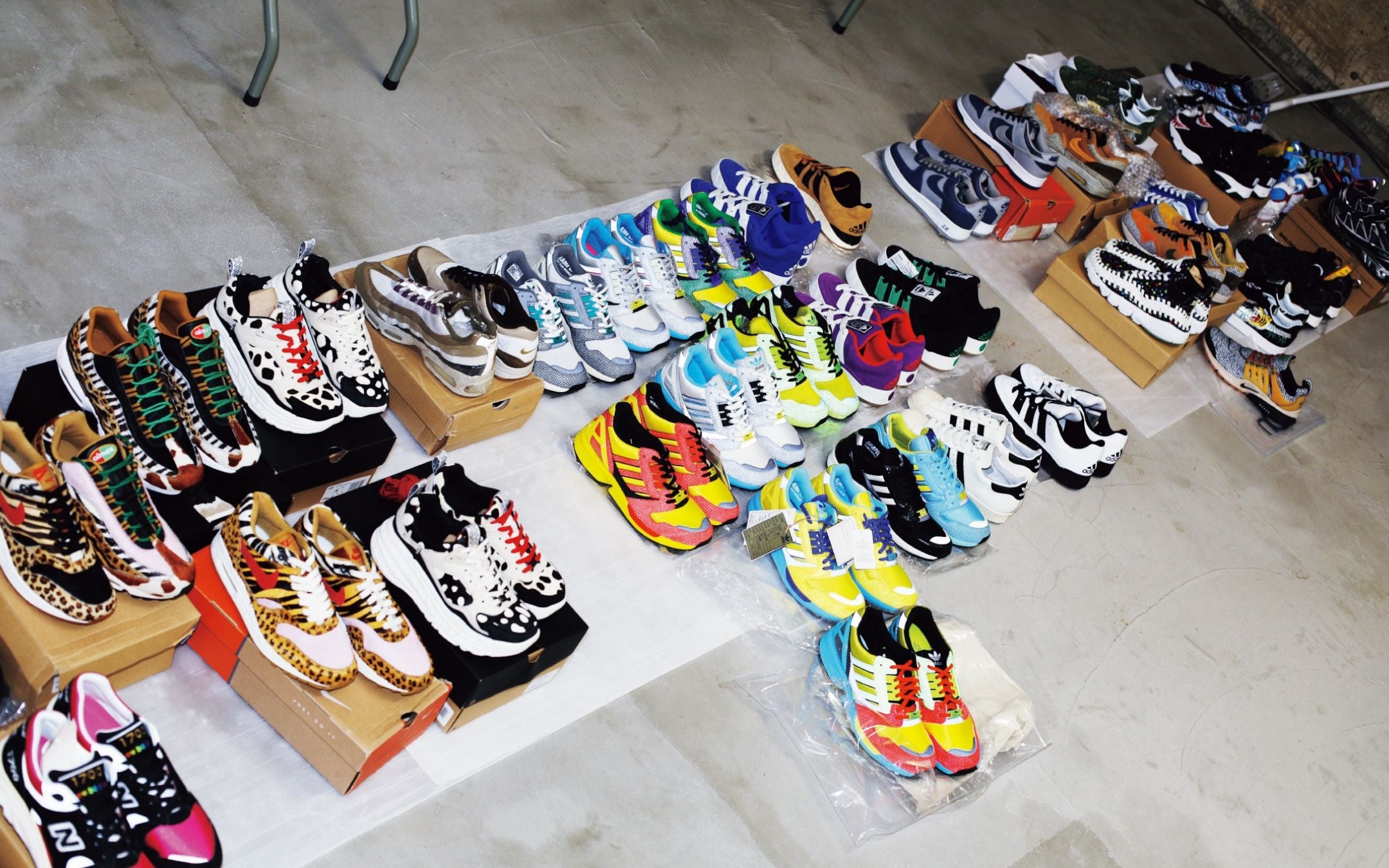 ”atmos”は、2000年、東京・原宿にヘッドショップをオープン。ファッションとしてのスニーカーをテーマに、店内はスニーカーウォールを設置。
