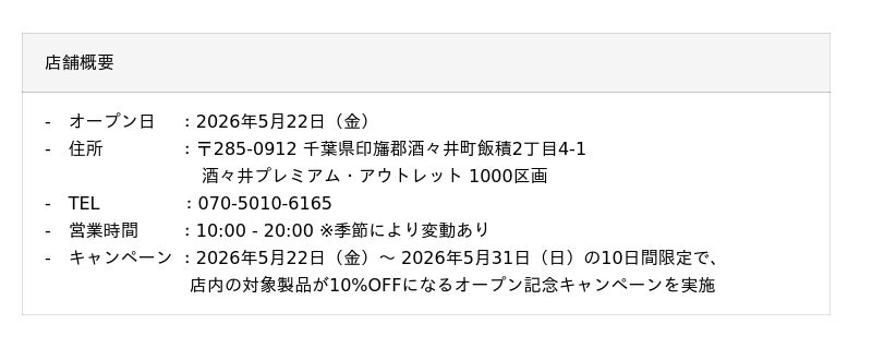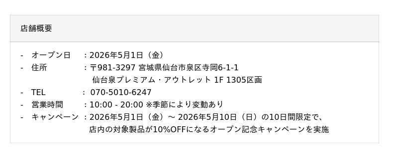 アンカー・ジャパン株式会社の子会社として常設直営店Anker Storeの運営事業を担うアンカー・ストア株式会社(本社:東京都港区、代表取締役CEO:猿渡 歩)は、2026年5月1日(金)に「Anker Store Outlet 仙台泉」、2026年5月15日(金)に「Anker Store Outlet 横浜ベイサイド」、2026年5月22日(金)に「Anker Store Outlet 酒々井」を順次オープンいたします。