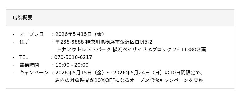 ※ 10%OFFのオープン記念キャンペーンについては、各店舗情報にて詳細を記載しております