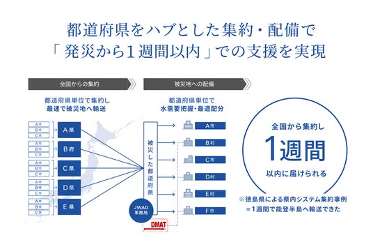 各市町村に分散して保有されている資機材を、平時から都道府県単位で把握・整理し、発災時には被災都道府県へ集約。水需要の把握と最適な配分を行うことで、「発災から1週間以内」に必要な支援を届けることを目指しています。