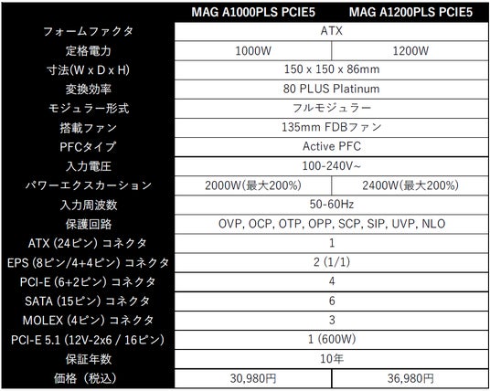 この度、エムエスアイコンピュータージャパン株式会社は、ATX 3.1およびPCIe 5.1対応の80 PLUS & Cybenetics Platinum認証電源ユニット「MAG A1000PLS PCIE5」、「MAG A1200PLS PCIE5」を、2026年4月17日(金)に発売いたします。