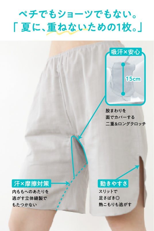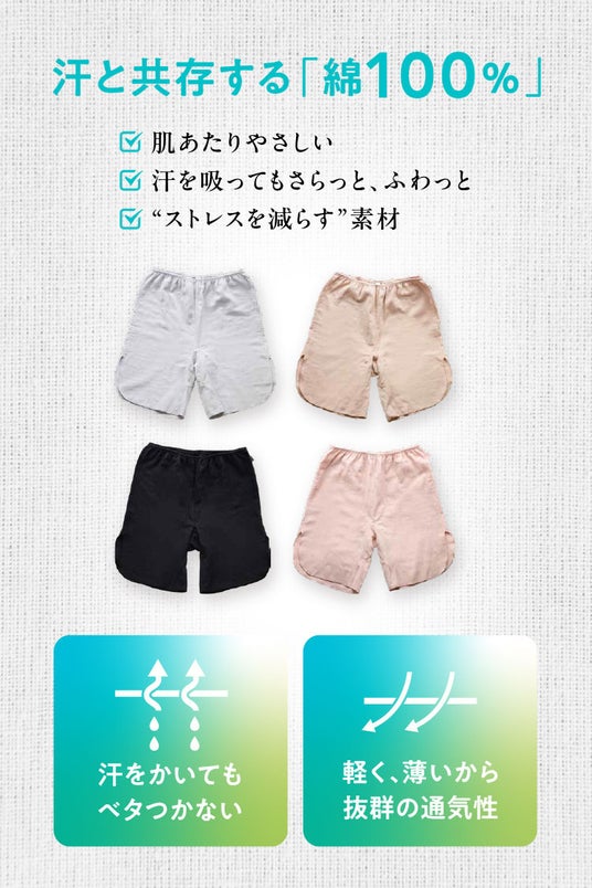 新たに発売される「ペチコートにもなる綿100%汗取り4分丈ショーツ」は、以下の特長を持ち、重ね履きを前提としない設計となっています。