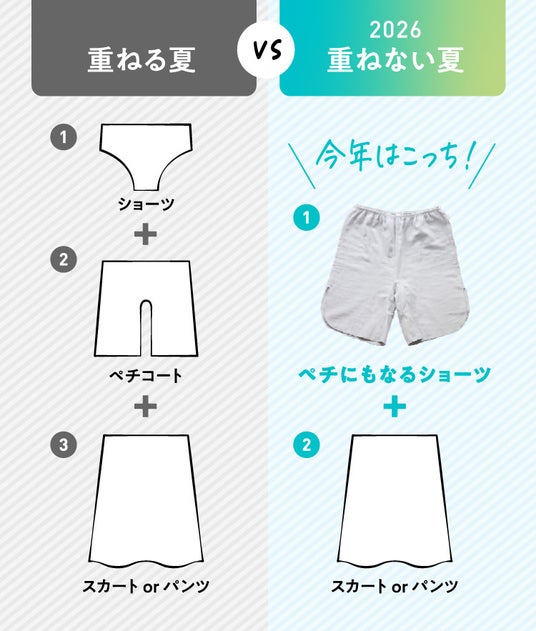 [開発者/只野優子]近年の猛暑・高湿度環境の中で、従来の「涼感素材を足す」「機能性インナーを重ねる」といった対策では、不快感を十分に解消できなくなっていると感じていました。特に女性の夏服は、透け対策や汗対策、身だしなみへの配慮から、結果として着用枚数が増えやすい構造があります。私たちはそこに着目し、暑さ対策を“足し算”ではなく“引き算”で考え直しました。ショーツとペチコートを一体化し、1枚で着用できる設計にしたのは、その発想からです。単に新しい下着を作ったということではなく、猛暑時代の衣服設計を見直す試みでもあります。